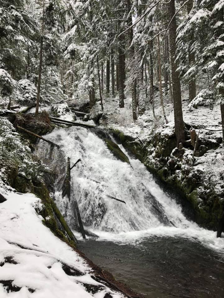 The short hike to Little Zigzag Falls is great any time of the year, but my family really enjoys it when there is just a touch of snow on the ground. The trailhead sits just above 3,000 feet in elevation, so the trail has snow much of the winter. I’m not a huge fan of driving in snow or ice, but the access to this particular trailhead is less challenging than other higher-elevation Mt. Hood hikes. Be sure to read up on winter driving, and follow chain rules. As always, come prepared with your essentials and anything else you might need for a cold, icy/snowy adventure. Thankfully, there is a traffic camera on Highway 26 right by the trailhead. Find the traffic camera for Highway 26 at USFS Rd 35 here.